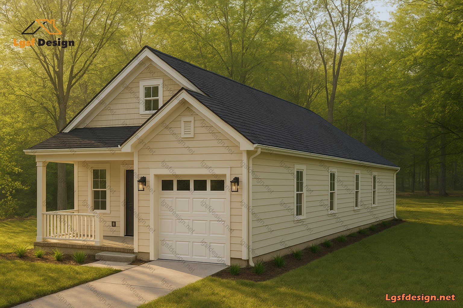 Discover the perfect blend of comfort and modern design with this stunning single-story home, spanning 64'8" by 26'. Featuring two spacious bedrooms, two well-appointed bathrooms, and a convenient one-car garage, this house offers an ideal layout for small families or those seeking a cozy retreat. The open-plan living area, complete with a vaulted ceiling, flows seamlessly into the kitchen and dining space, creating a welcoming environment for gatherings. Enjoy the charm of front and rear porches, perfect for relaxing outdoors, surrounded by lush greenery. With a total of 1,614 sq ft space, this home combines practicality with elegance. Order the architectural and LSF structural plans now to bring your dream home to life!