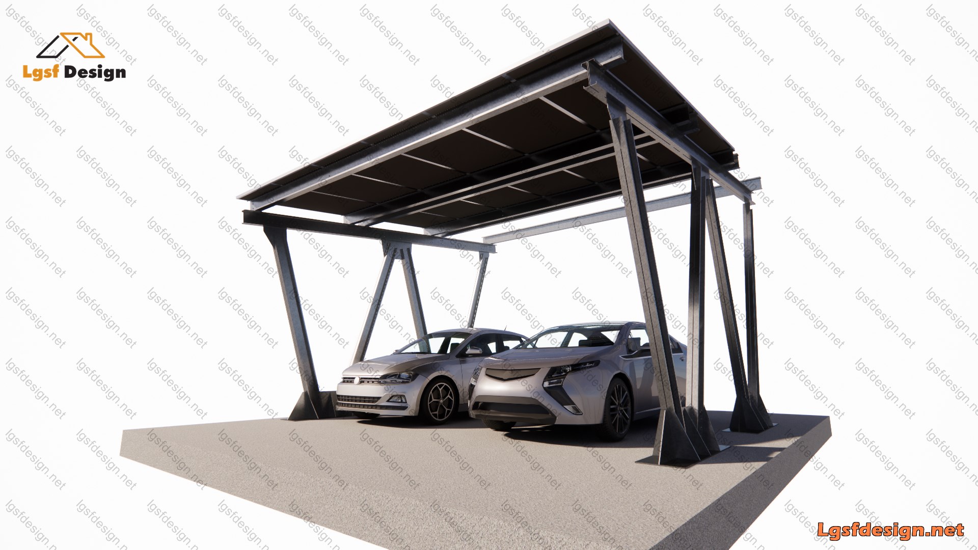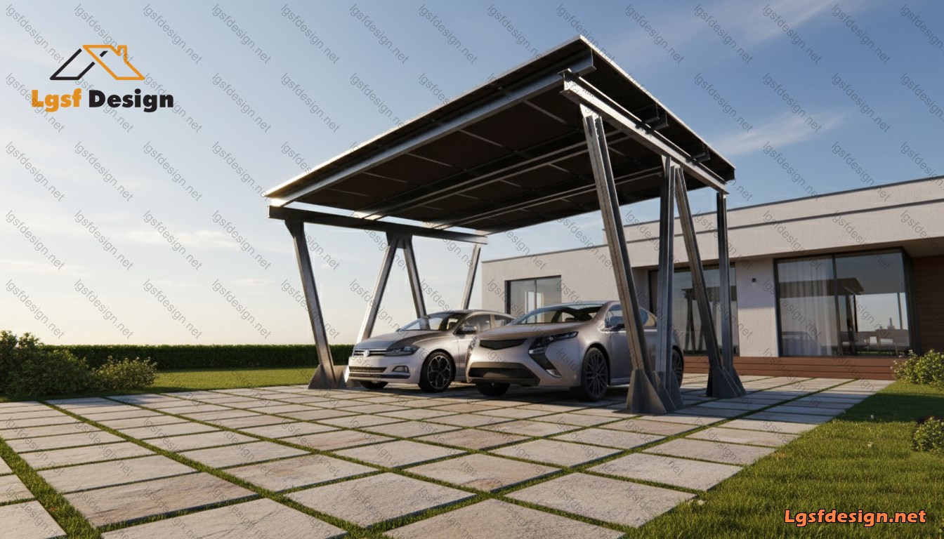 The roof structure is specifically prepared to support solar panels, offering an ideal solution for those who value sustainability and energy efficiency. With its galvanized steel framing and minimalist architectural lines, this LSF carport not only provides protection and functionality but also enhances the visual appeal of any modern home or property.