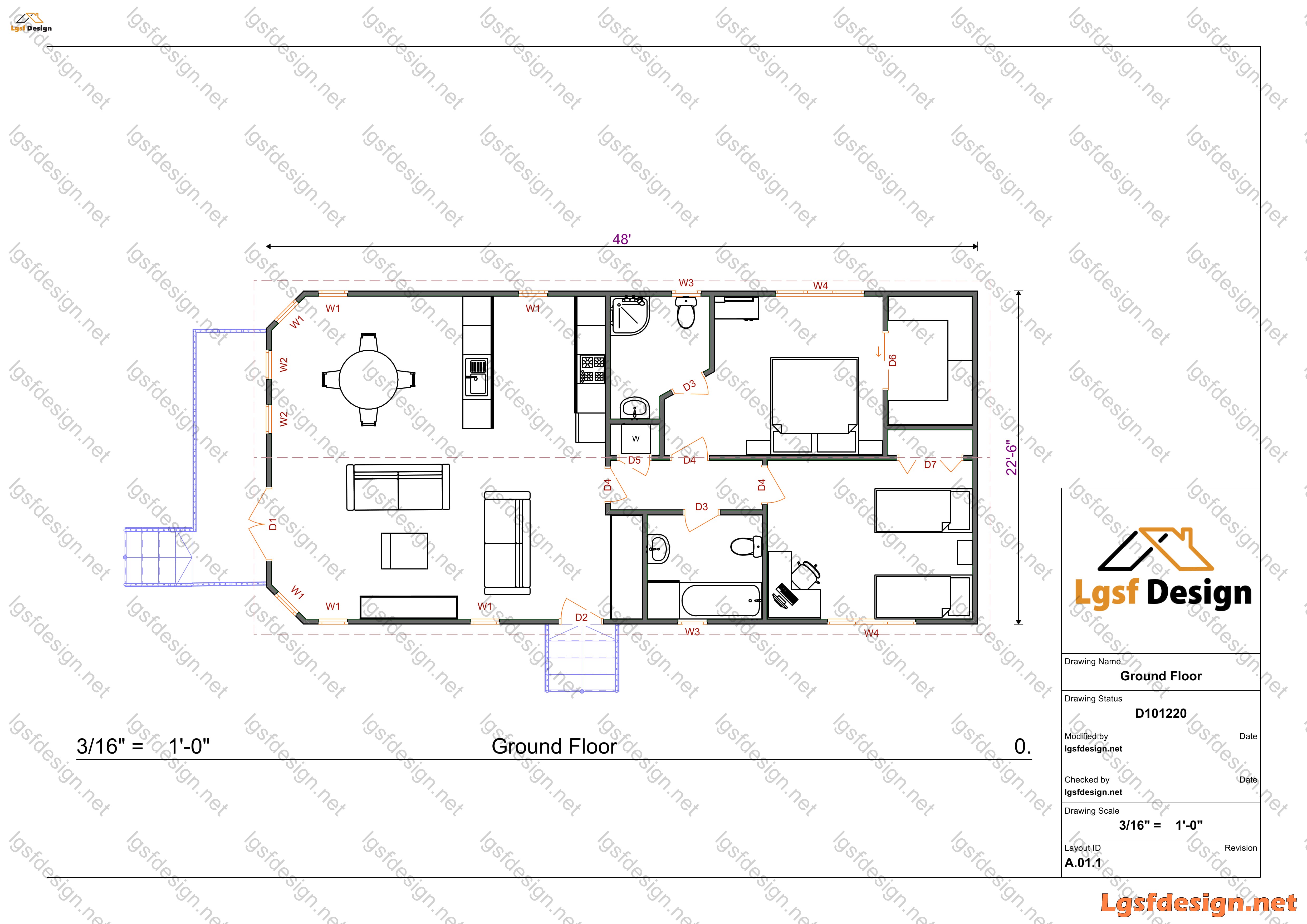 Outside, you'll find a porch area, perfect for enjoying your morning coffee or evening relaxation. The home's compact footprint of 48' x 22.5' makes it ideal for various lot sizes while still providing all the amenities of a larger home.