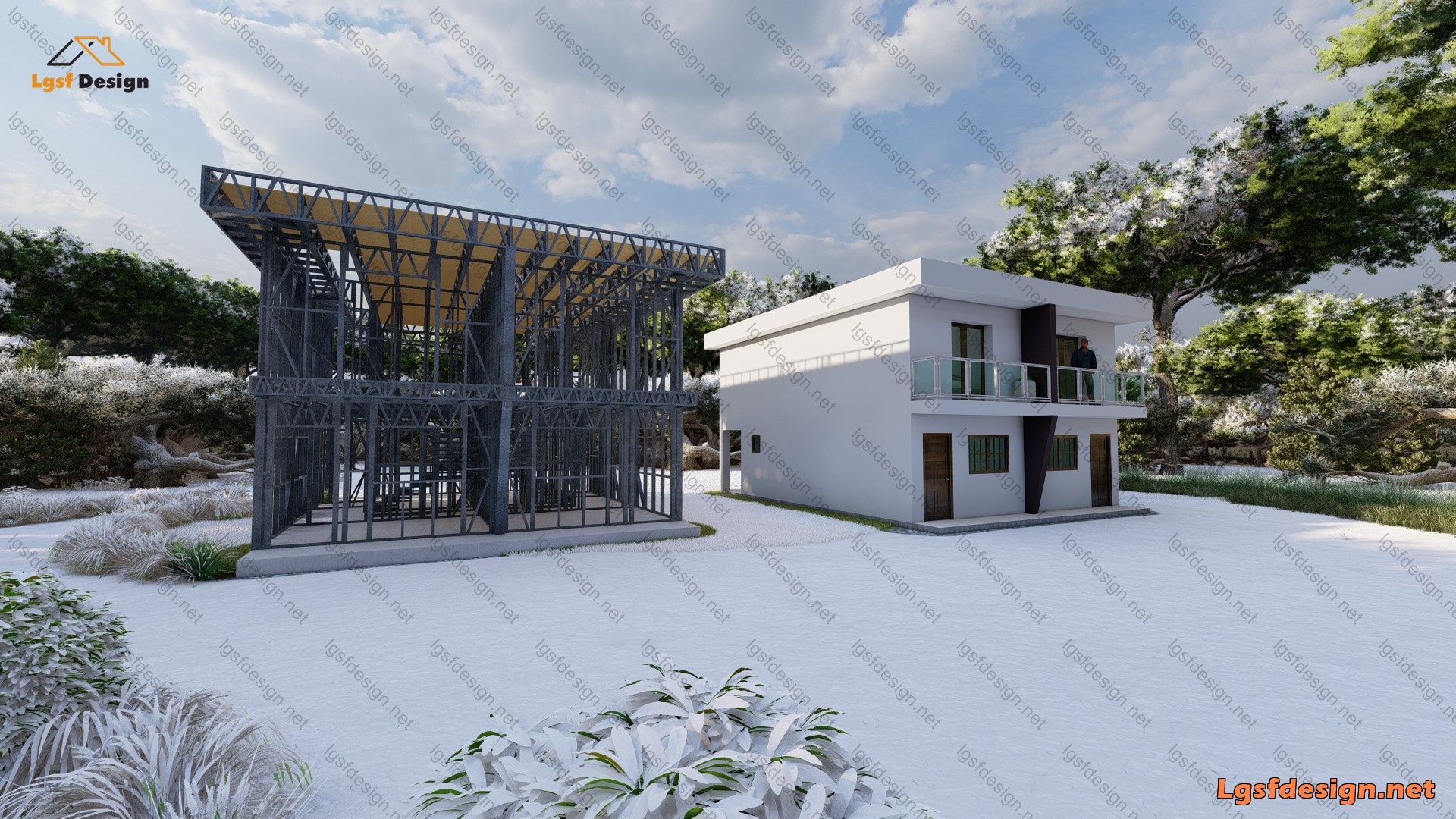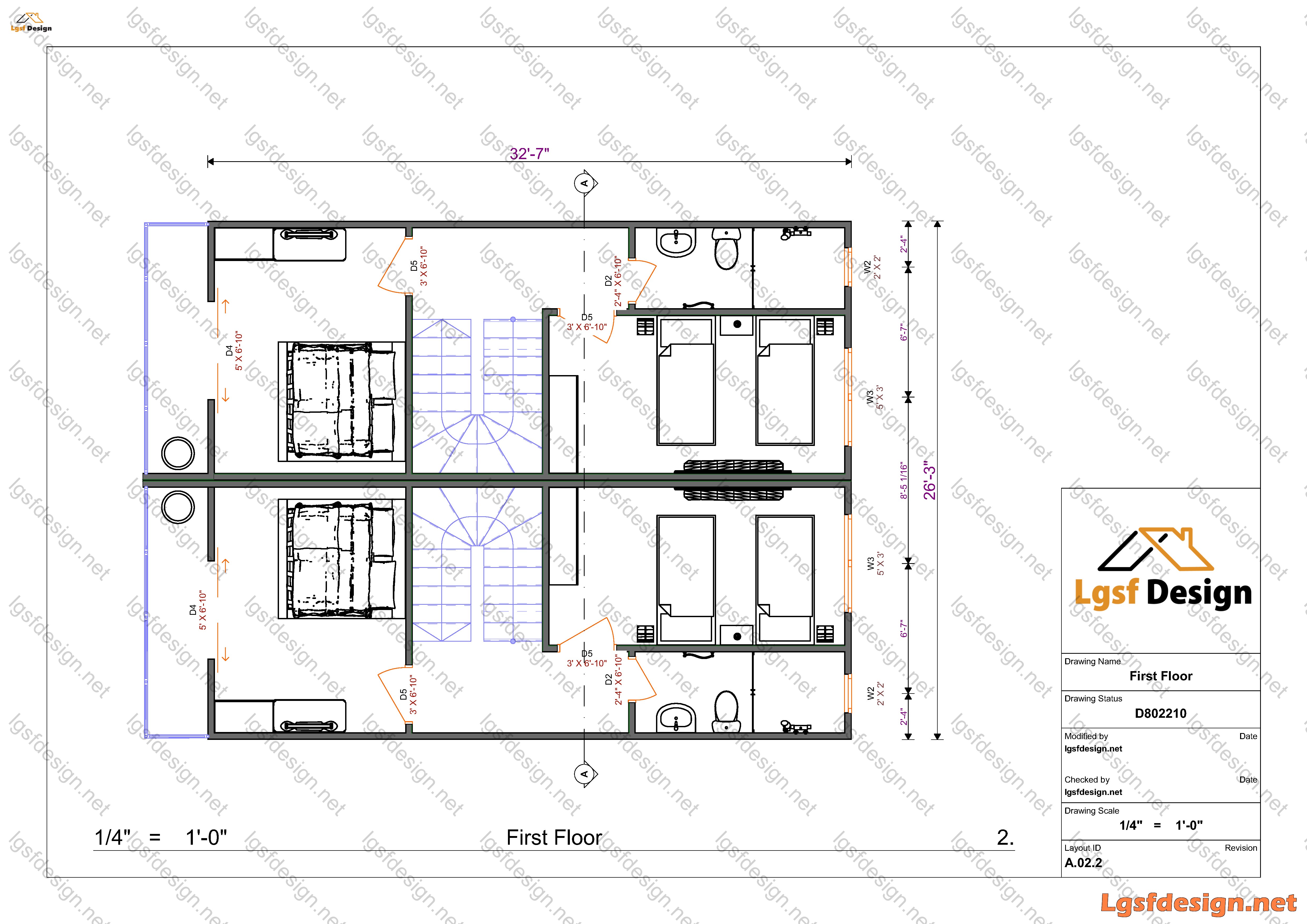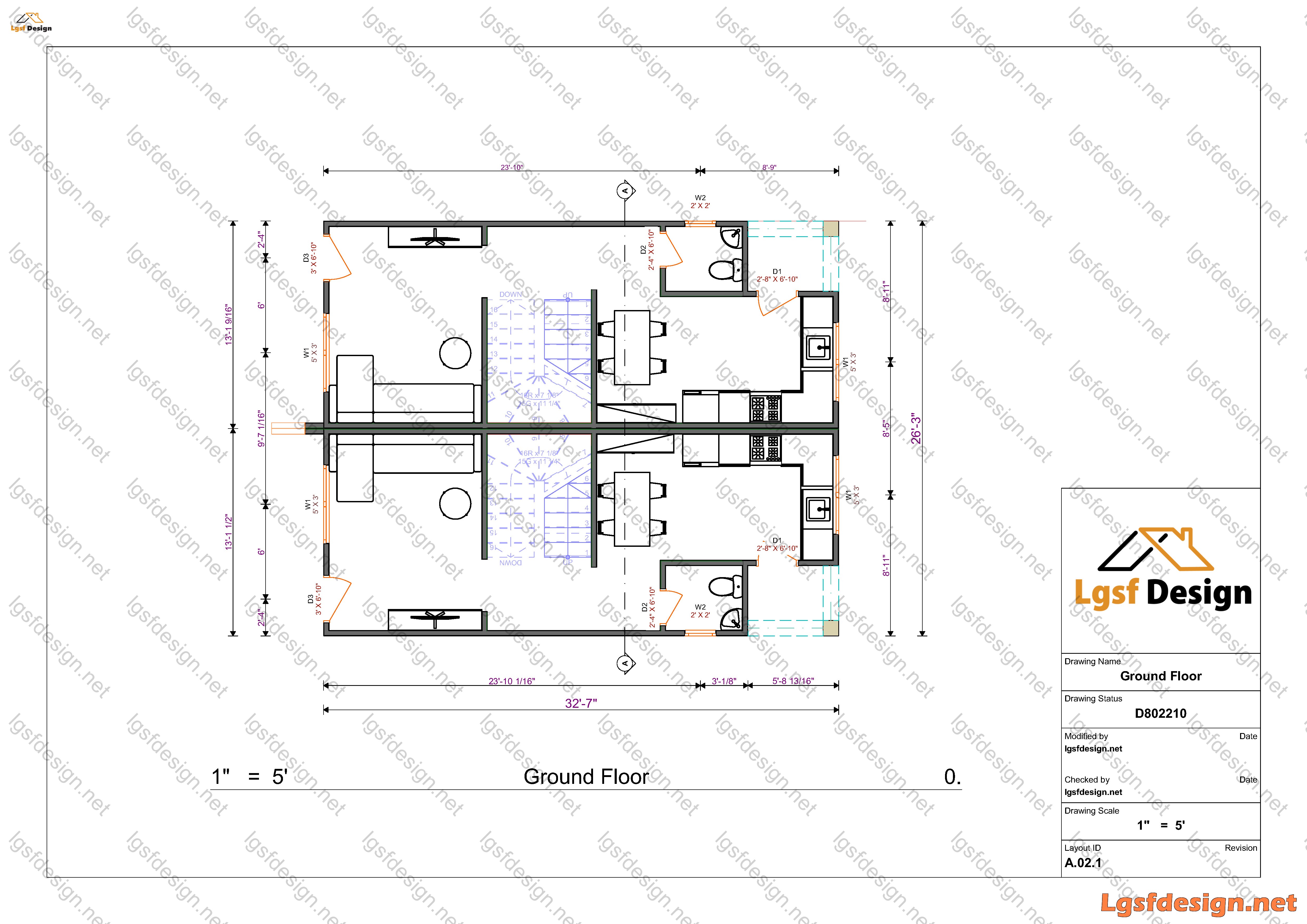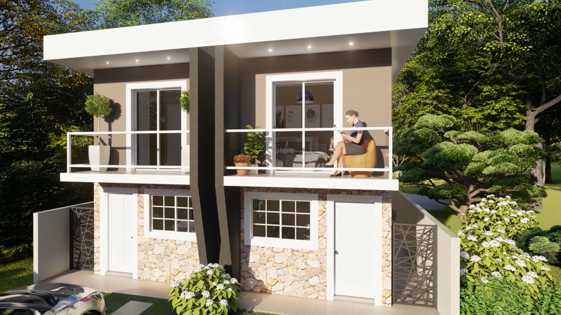 This clever design showcases two adjoining 75-square-meter homes, totaling 150 square meters. Each unit features a ground floor with an open living space, equipped kitchen, and bathroom. The first floor of each unit contains two large bedrooms with built-in closets and a full bathroom. Central spiral staircases connect the floors. Large windows provide abundant natural light. This efficient design offers an ideal combination of private and public spaces in a compact, flexible format, perfect for modern living arrangements.