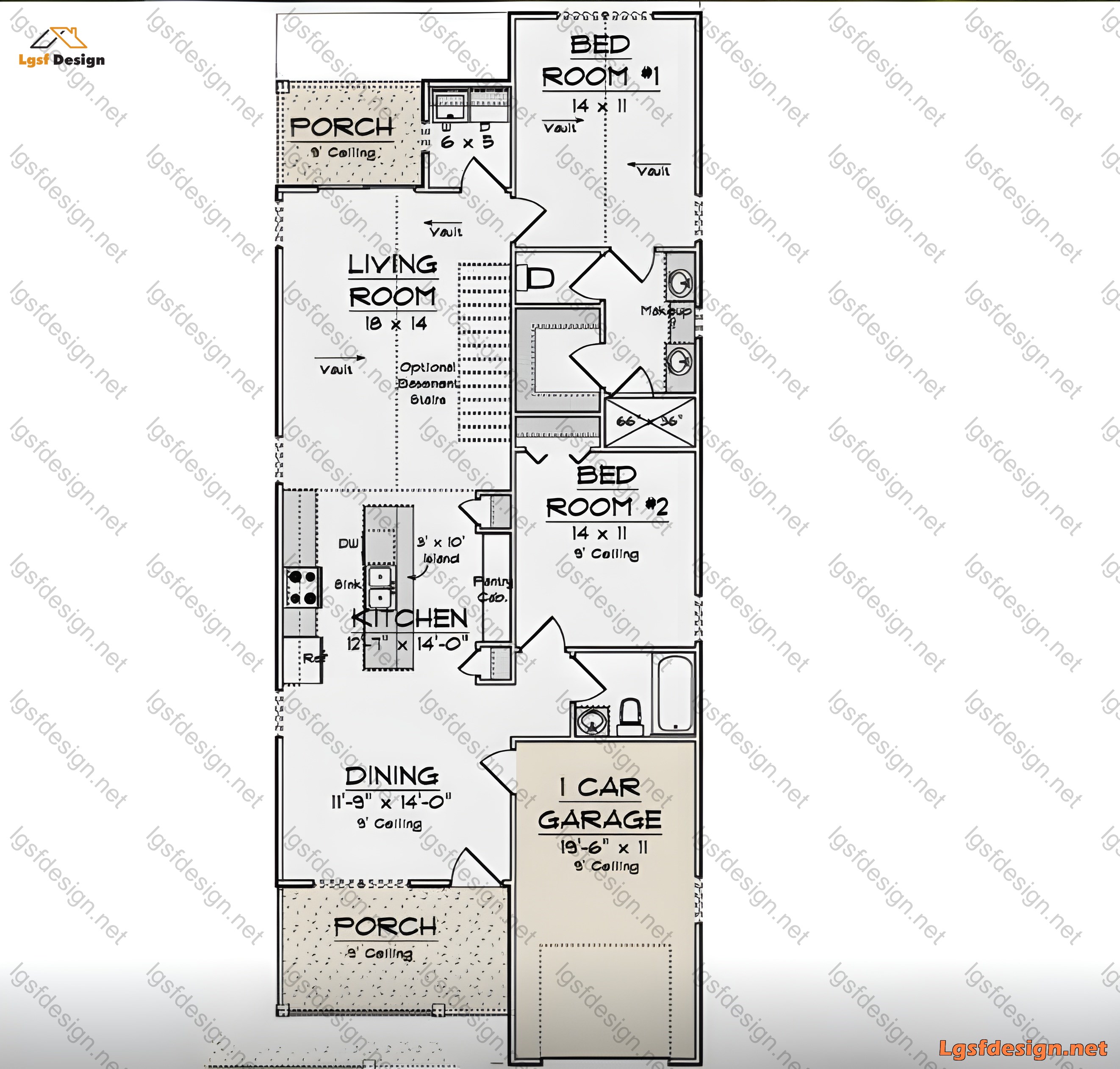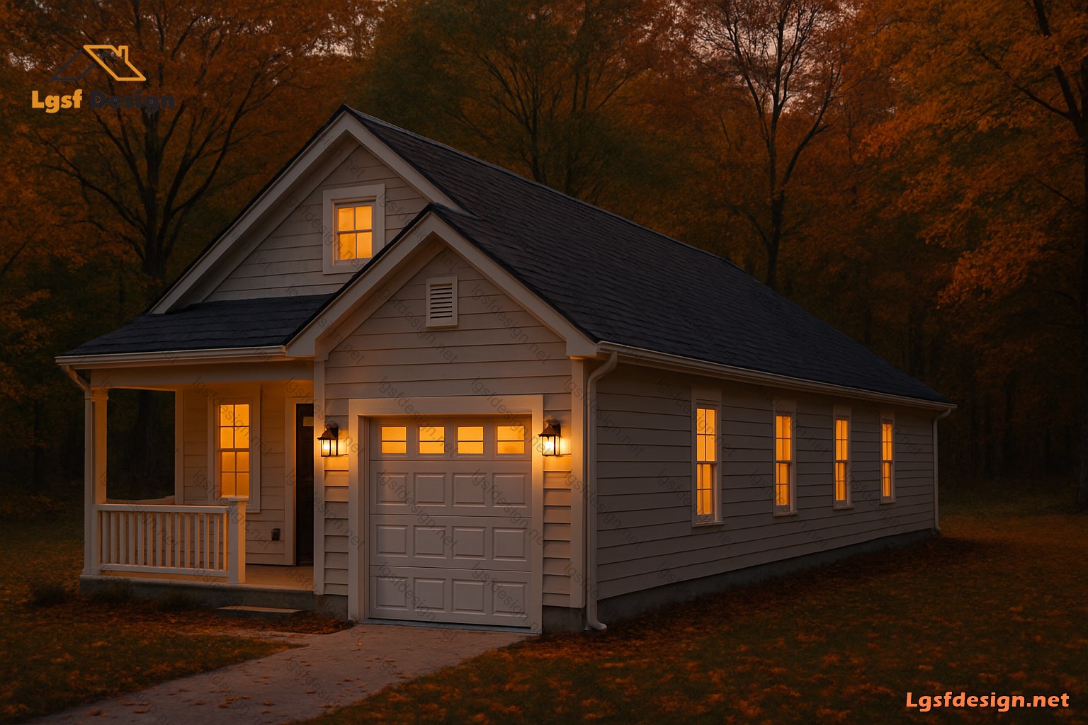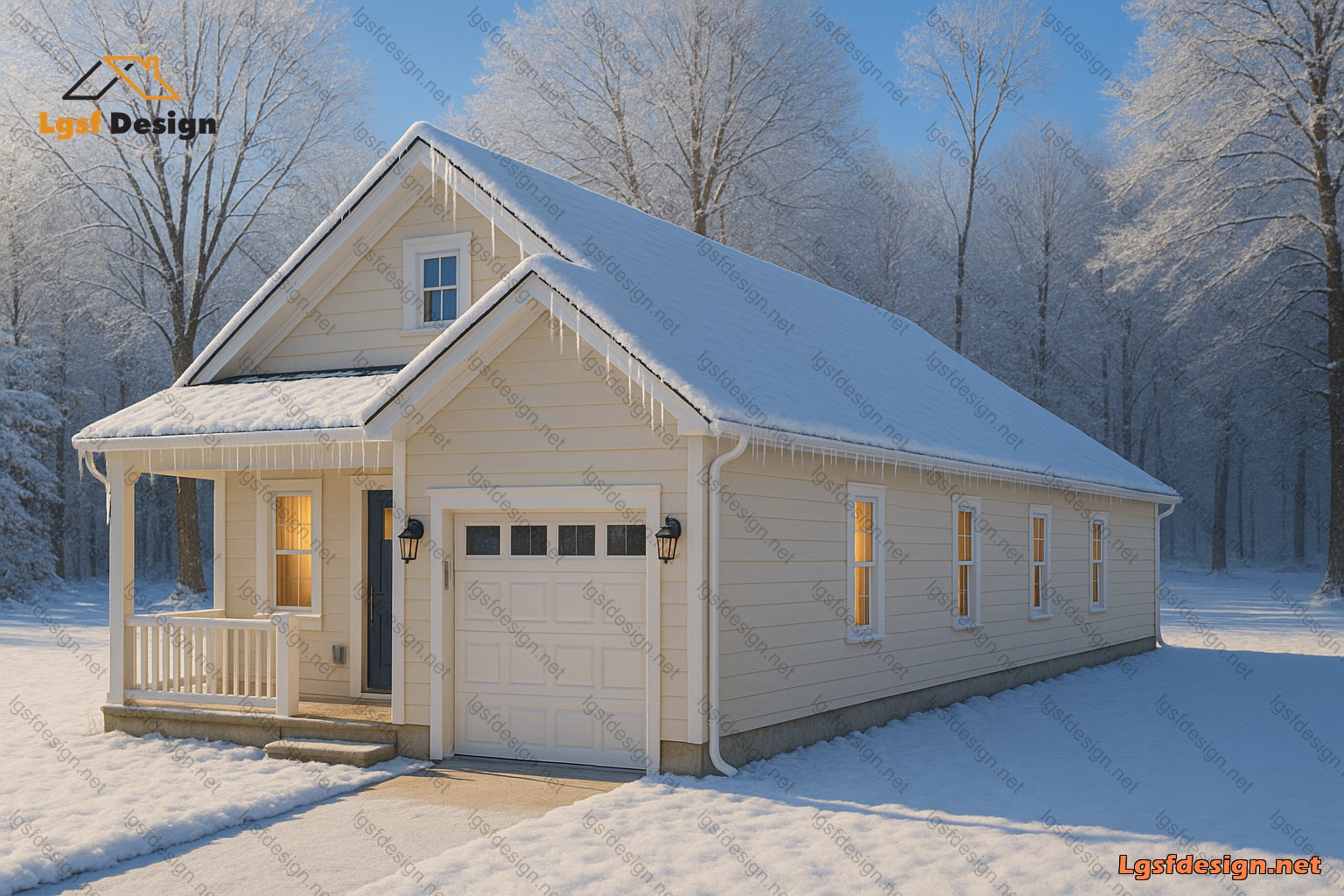 Discover the perfect blend of comfort and modern design with this stunning single-story home, spanning 64'8" by 26'. Featuring two spacious bedrooms, two well-appointed bathrooms, and a convenient one-car garage, this house offers an ideal layout for small families or those seeking a cozy retreat. The open-plan living area, complete with a vaulted ceiling, flows seamlessly into the kitchen and dining space, creating a welcoming environment for gatherings. Enjoy the charm of front and rear porches, perfect for relaxing outdoors, surrounded by lush greenery. With a total of 1,614 sq ft space, this home combines practicality with elegance. Order the architectural and LSF structural plans now to bring your dream home to life!
