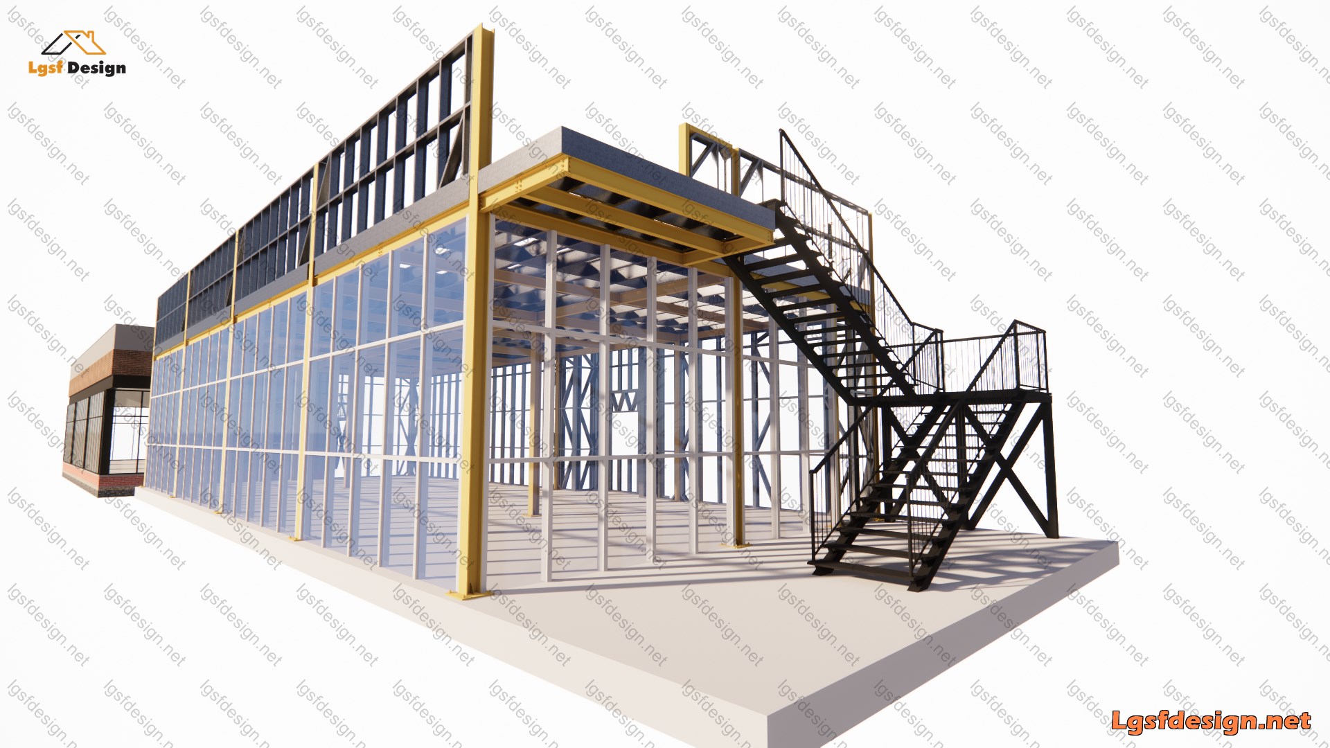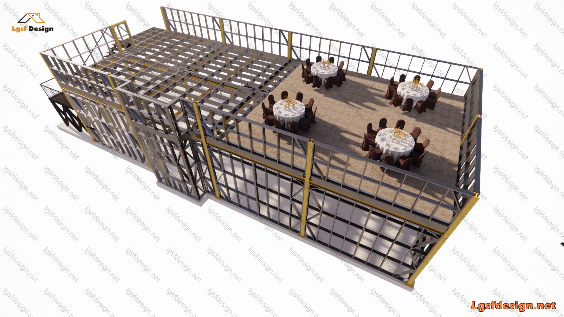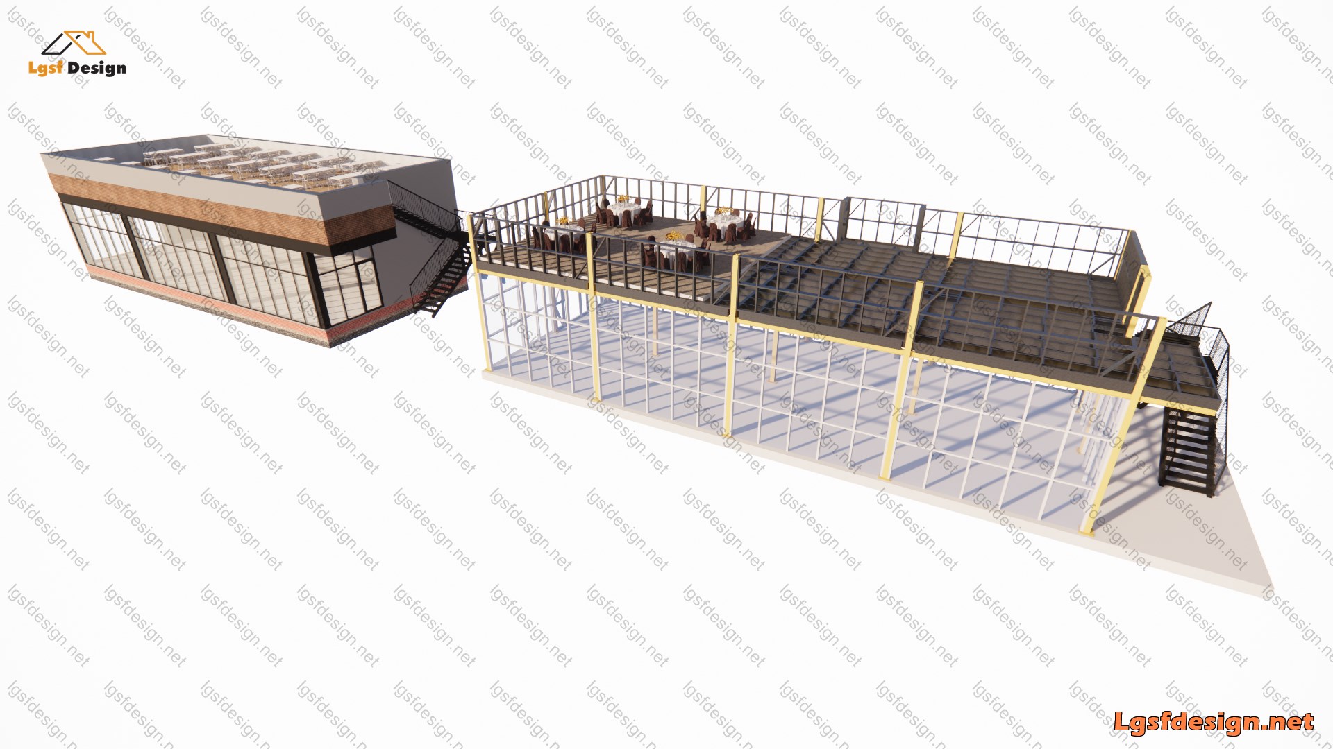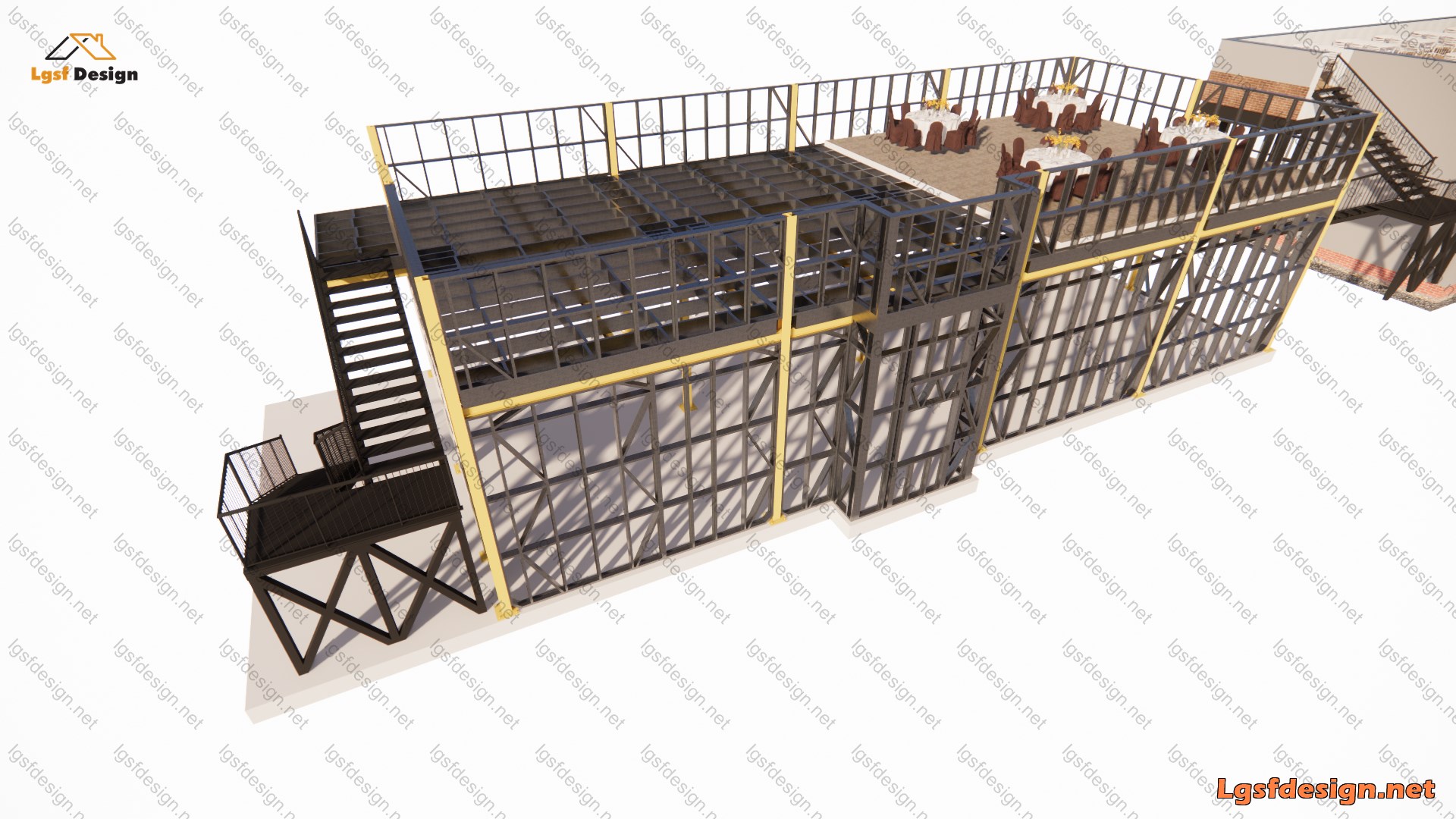 This two-story restaurant building, covering an area of 160 m² (1,722 ft²), is planned to be constructed in Romania. The main load-bearing structure utilizes hot-rolled steel, ensuring strength and durability. The roof is crafted from LSF profiles measuring 250 mm, while the perimeter walls are built with 140 mm profiles, providing excellent structural integrity and design flexibility.